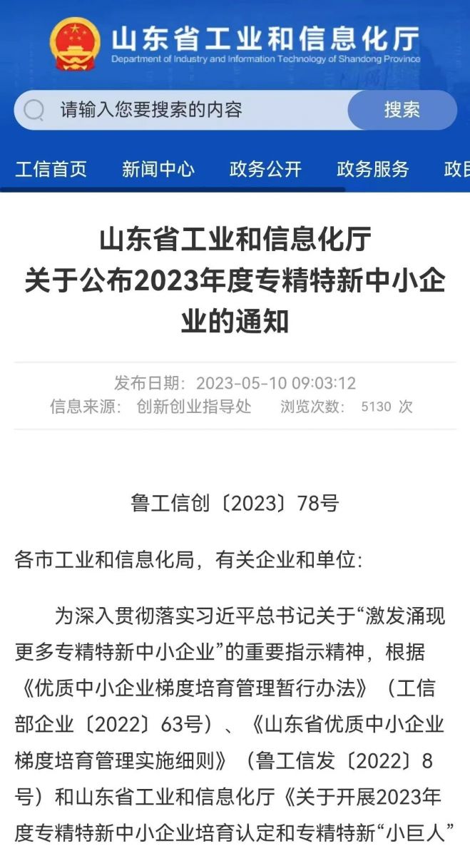 近日,山东省工业和信息化厅印发《关于公布2023年度专精特新中小企业的通知》,公布了2023年度全省专精特新中小企业名单,山东祺添新材料有限公司凭借多年来在新材料领域的突出表现,被认定为2023年度山东省专精特新中小企业。