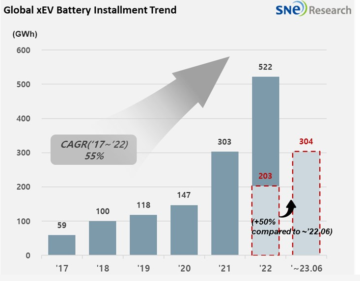 根据市场调研机构SNE Research发布的数据显示,今年上半年全球新登记动力电池装车量为304.3GWh,同比增长50.1%。