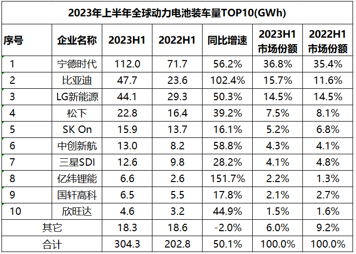 1-6月全球动力电池装车量TOP10的企业分别是:宁德时代、比亚迪、LG新能源、松下、SK On、中创新航、三星SDI、亿纬锂能、国轩高科、欣旺达。