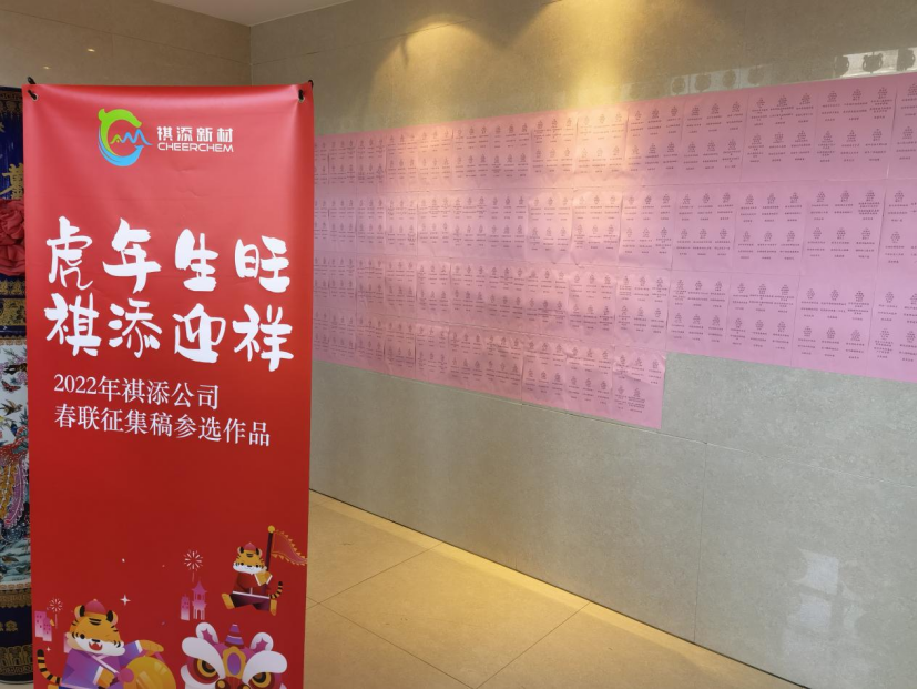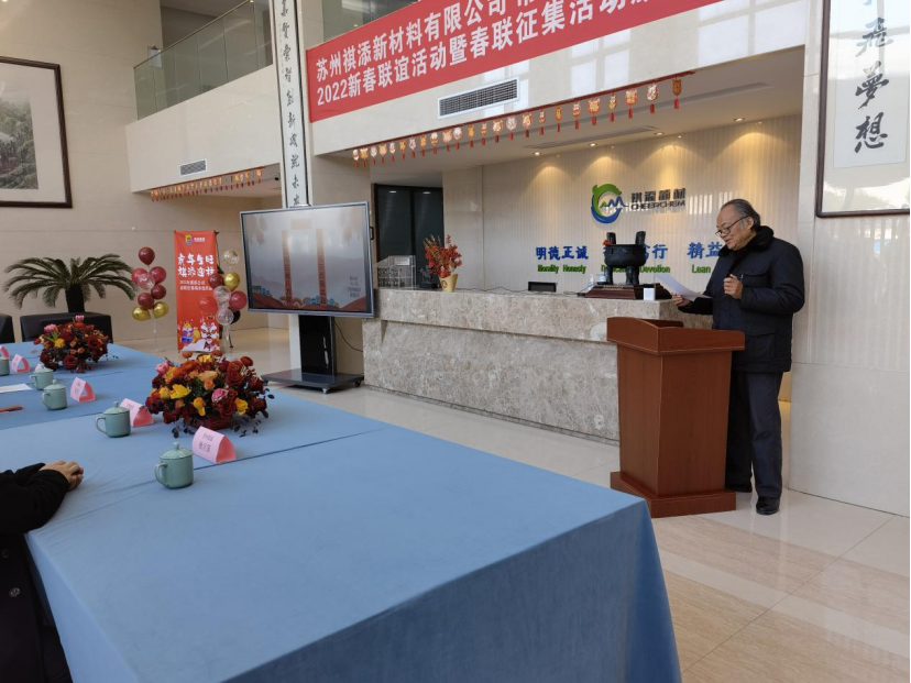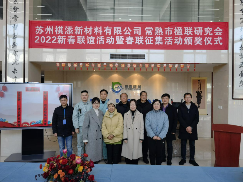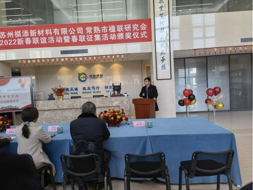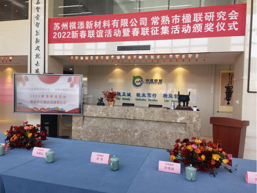 2022年1月15日上午,在祺添公司综合楼大厅隆重举行了“2022新春联谊活动暨春联征集活动颁奖仪式”,公司董事长傅人俊,总经理徐月国等领导与员工以及常熟楹联协会专家们出席了颁奖典礼,公司春联征集评选活动圆满成功。