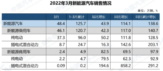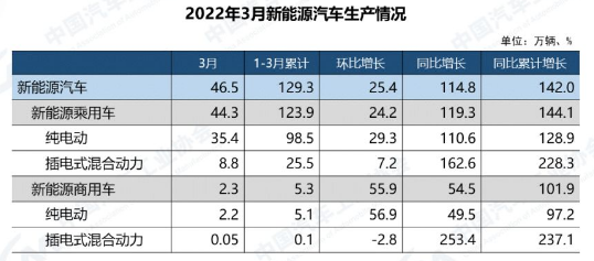4月11日,中汽协发布数据,2022年1-3月我国新能源汽车累计产量129.3万辆,同比增长142%;销量125.7万辆,同比增长138.6%。 整体来看,2022年一季度新能源汽车延续了快速增长势头,产销均突破百万辆,市场渗透率达19.3%,较去年全年13.4%的占比呈稳步增长态势。