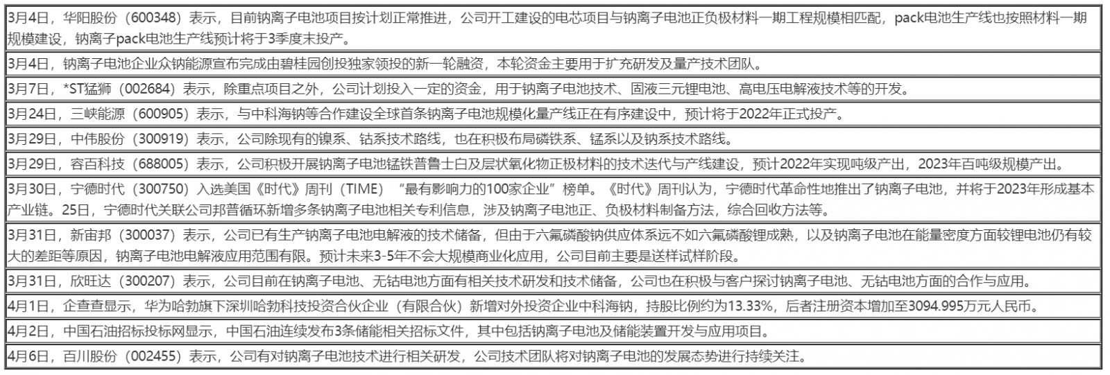 除了政策层面暖风频吹,企业也抢先布局钠离子电池市场,近两个月动作频频: