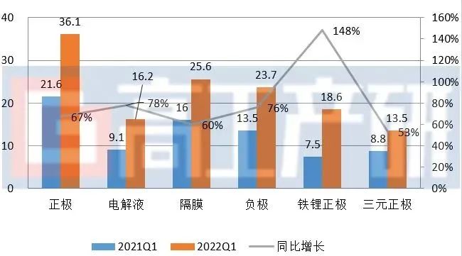 2、核心主材出货量同比增长超50%,其中,正极材料市场铁锂占比超50%