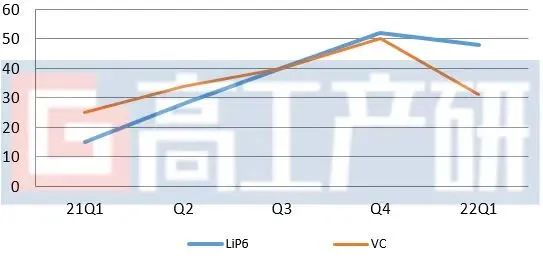 Q1碳酸锂市场价格出现松动,部分企业成交意愿强,市场库存逐渐减少,Q1六氟磷酸锂的平均价格降至48万元/吨,受锂盐产能释放影响,至3月底,六氟磷酸锂市场平均价格已临近30万元/吨。VC产品市场平均价由2021Q4的50万元/吨,下跌至一季度的31万元/吨,至3月底,部分产品实际成交价已跌破15万元/吨。