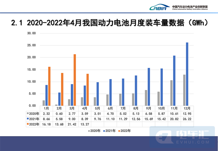 受新能源汽车产销量的影响,对应的动力电池装机量数据也有明显变化。电池联盟数据显示,4月份整体动力电池产量为29GWh,同比增长124.1%,但环比降低了26.1%;装机量为13.3GWh,同比增加58.1%,但环比降低了38%。