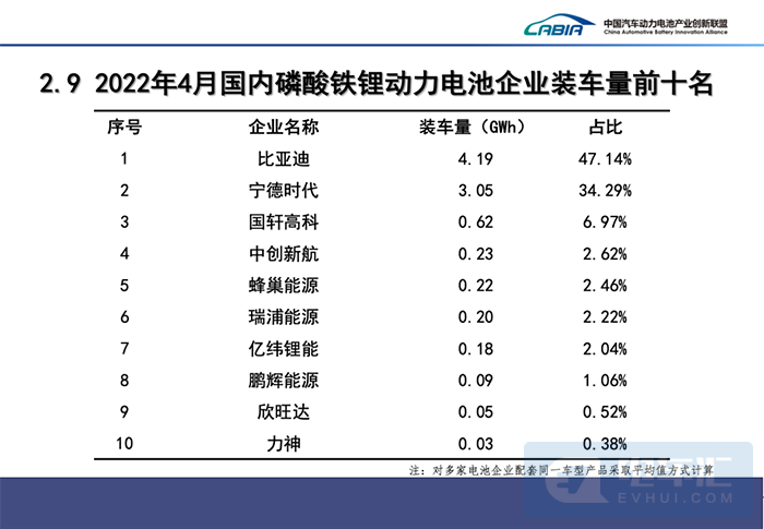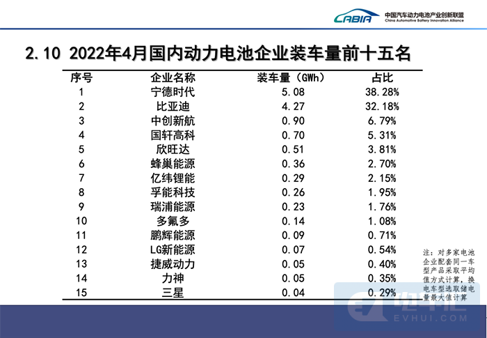 企业的变化更为明显,尤其是对于宁德时代和比亚迪两大巨头而言。4月宁德时代市占率为38.28%,而此前一直是接近50%的状态(3月市占率50.49%);第二名比亚迪的市占率则从3月的19.24%增长至32.18%,两者的市占率仅差6个百分点了。