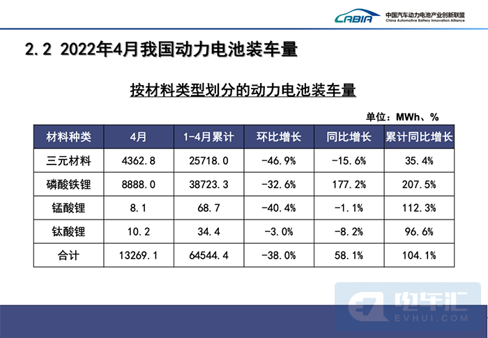 此外,磷酸铁锂和三元锂电池差距也在继续加大,在2022年一季度中三个月持续占优的磷酸铁锂电池(3月磷酸铁锂电池装机量占比已经超过60%),在4月份进一步压缩了三元锂电池的产量和装机量的占比空间。虽然产量和装机量磷酸铁锂电池均出现较大幅度的环比下滑,但同比依旧保持高增长,且无论是环比下降幅度还是同比增长幅度都远远优异于三元锂电池。这也导致磷酸铁锂电池的产量和装机量占比却不减反增。磷酸铁锂电池的产量为18.6GWh,同比增长200.7%,环比下降21%,占比高达64.3%;而装机量为8.9GWh,同比保持增长为177.2%,但环比下降了32.6%,占比为67%。