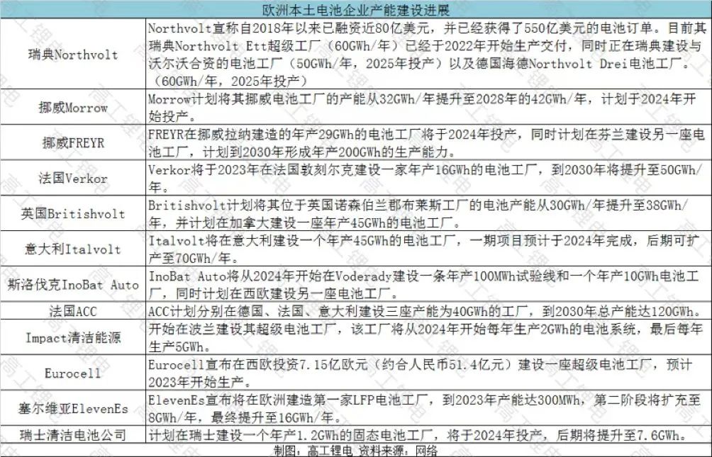 欧盟碳关税法案正式落地叠加电动化提速,欧洲本土动力电池产业链建设进入加速阶段。一个明显的变化是,进入2022年以来,包括瑞典Northvolt、法国Verkor、法国ACC、斯洛伐克InoBat Auto、英国Britishvolt、挪威Freyr、挪威Morrow、意大利Italvolt、塞尔维亚ElevenEs等多家欧洲本土电池企业,都更新了其动力电池工厂建设计划,建设进度明显提速。