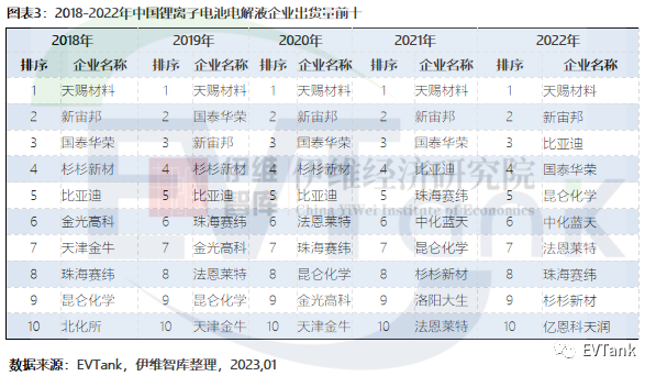 2022年相比2021年发生了较大的变化,天赐材料的行业龙头地位进一步稳固,其市场份额由2021年的28.8%提升到2022年的35.9%;国泰华荣行业第三的位置被比亚迪取代;昆仑化学、中化蓝天、法恩莱特和珠海赛纬四家企业之间的竞争处于焦灼状态;中国电解液行业CR10由2021年的84.3%提升到2022年的88.3%。