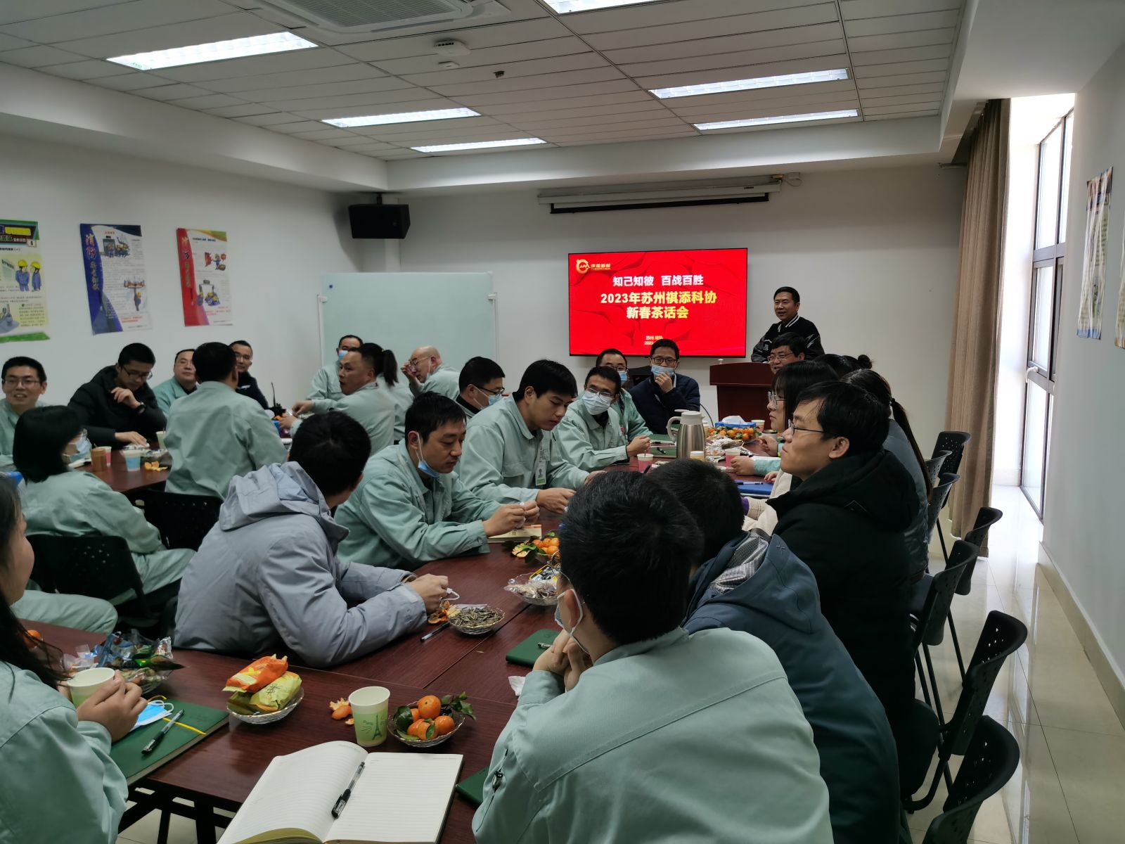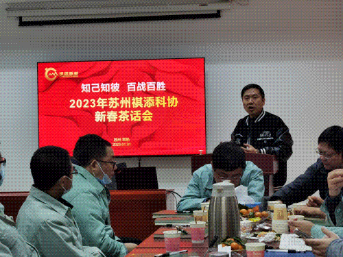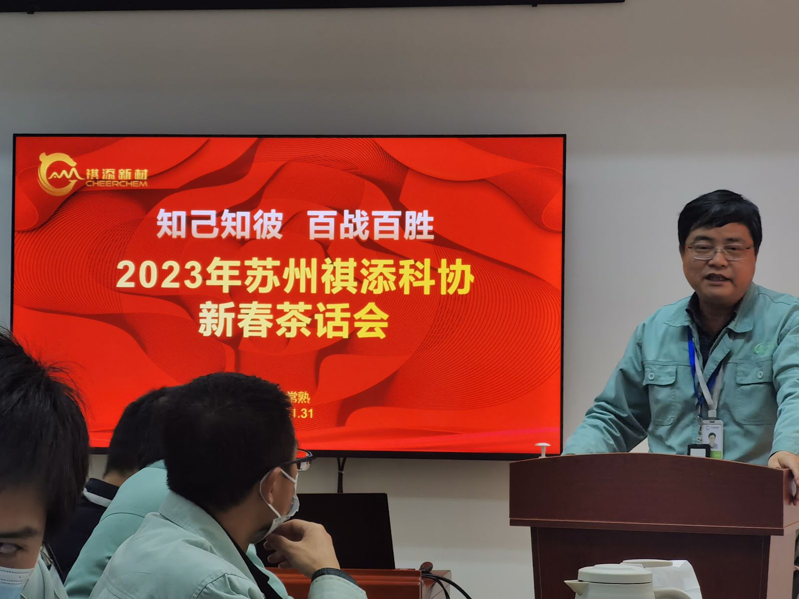 2023年1月31日上午,苏州祺添科协组织了以“知己知彼,百战百胜”为主题的新春茶话会,总经理徐月国、副总经理/董事长助理及各部门负责人、部门代表近40人齐聚综合楼培训教室,话市场,聊研发,说生产,议品管,谈安全,评技术,共议发展大计、共话美好未来。茶话会由祺添科协秘书长、董事长助理顾乃刚主持。
