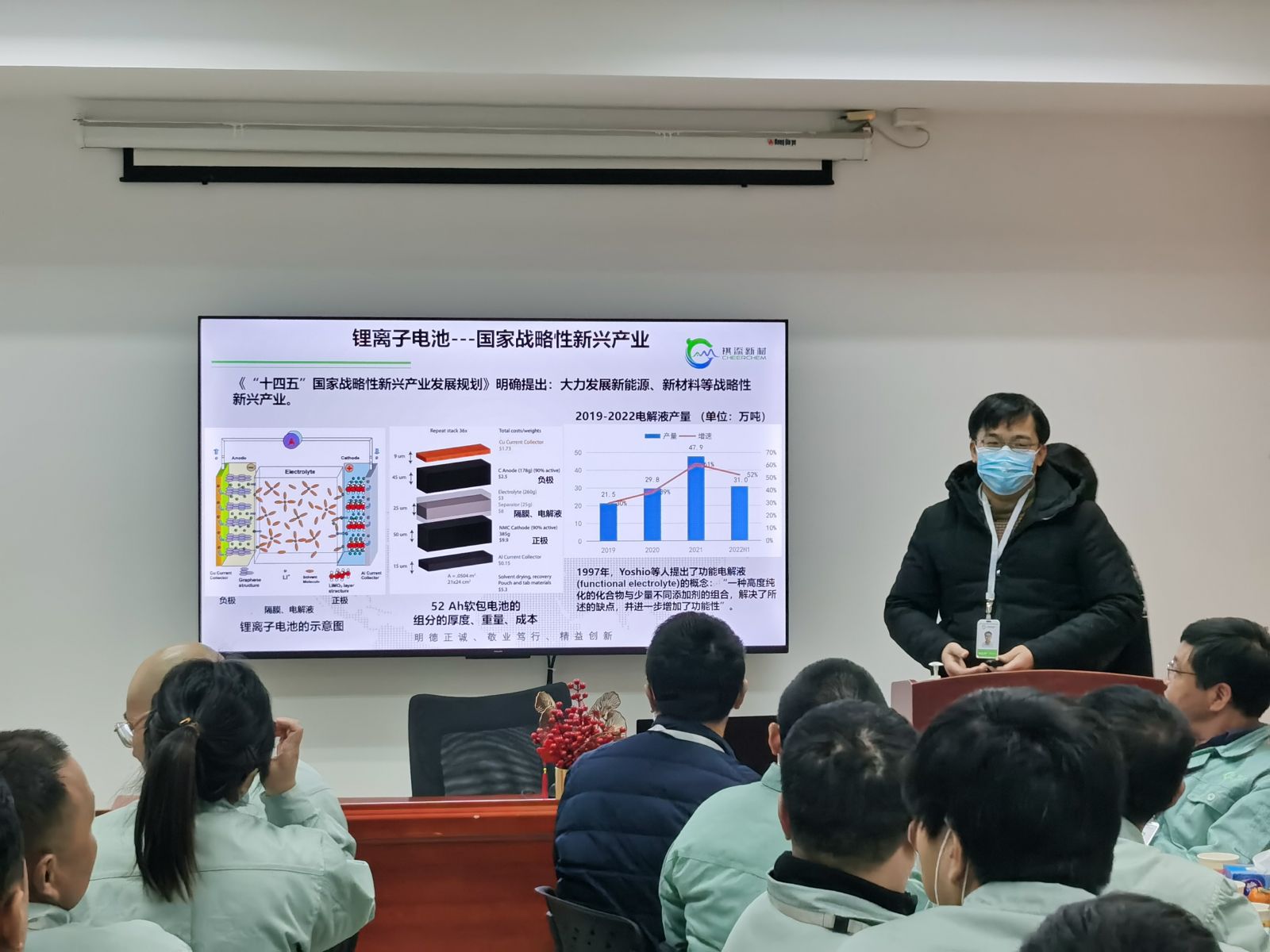 首先,研发总监蒋博士进行了茶话会的开篇致辞,他从电解液添加剂行业知识的角度出发抛砖引玉,向与会人员介绍了添加剂的种类,化学原理,产品性能对比等,并通过专业的知识分析了未来电解液添加剂产品发展的方向,提出了公司未来产品的发展思路。