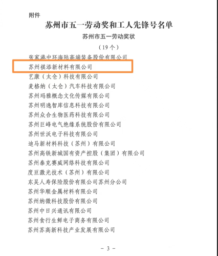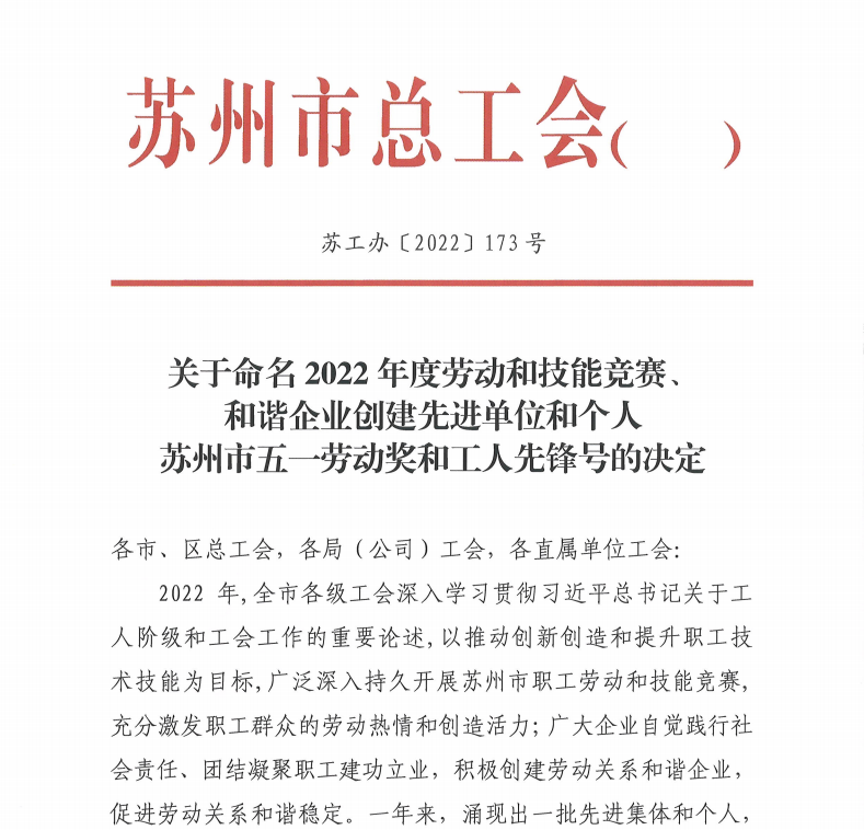 近日,苏州市总工会颁发了《关于命名2022年度劳动和技能竞赛、和谐企业创建先进单位和个人苏州市五一劳动奖和工人先锋号的决定》的通知文件,苏州祺添荣获“苏州市五一劳动奖状”,傅人俊董事长荣获“苏州市五一劳动奖章”的荣誉。
