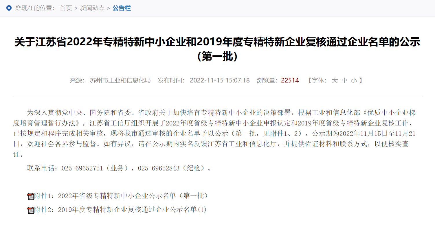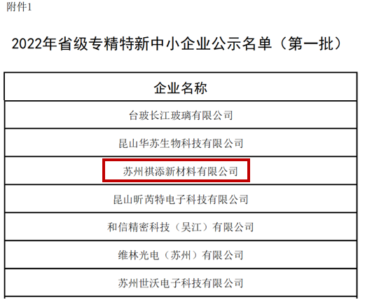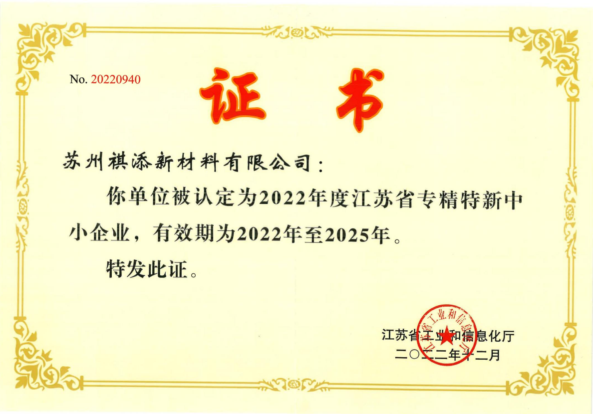 近日,根据江苏省工业和信息化厅发布的《关于江苏省2022年专精特新中小企业和2019年度专精特新企业复核通过企业名单的公示(第一批)》,苏州祺添新材料有限公司凭借多年来在新材料领域的突出表现,被认定为2022年度江苏省专精特新中小企业。